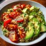 There are some recipes that just click, the ones that instantly become part of your regular rotation. For my family, this Avocado and Tomato Quinoa Bowl is one of those recipes. I first threw it together on a hectic Tuesday evening when I was craving something fresh, healthy, and satisfying, but had very little time or energy to cook an elaborate meal. I had some leftover quinoa, a couple of perfectly ripe avocados on the counter, and a pint of cherry tomatoes bursting with summer sweetness. What started as a “clean out the fridge” experiment turned into an absolute revelation. The moment my husband took his first bite, his eyes widened. He loved the creamy texture of the avocado against the slight pop of the quinoa, all brightened by the zesty lime dressing. Even my kids, who can be notoriously skeptical of anything overly “green,” were won over by the vibrant colors and the simple, clean flavors. It’s now our go-to for a quick weeknight dinner, a healthy packed lunch for work and school, and even a light and refreshing dish to bring to a summer barbecue. It’s more than just a recipe; it’s a bowl of vibrant, feel-good energy that never fails to make us feel nourished and happy. It’s proof that the most delicious meals are often the simplest, relying on the quality of fresh ingredients to truly shine.