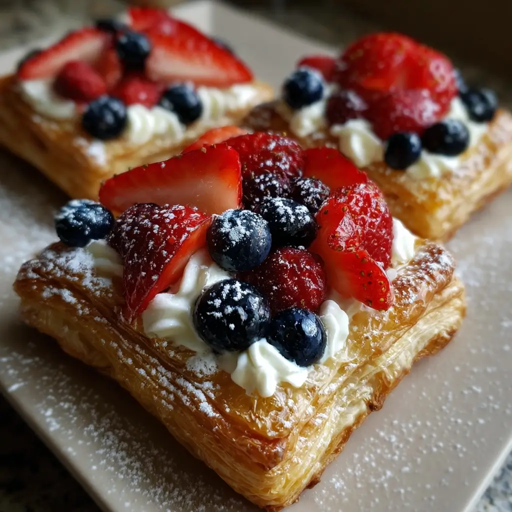 Of all the recipes that have graced my kitchen over the years, few have achieved the legendary status of these Berry and Cream Puff Pastry Squares. They began as a happy accident, a way to use up a sheet of puff pastry and a punnet of berries before they went past their prime. I never expected them to become the most requested dessert for family gatherings, potlucks, and quiet Sunday brunches. The first time I served them, a hush fell over the table, quickly replaced by the satisfying crunch of flaky pastry and murmurs of delight. My kids, who are usually my toughest critics, now ask for “those puffy berry things” on a weekly basis. What makes them so special is their deceptive simplicity. They look like they came from a high-end French patisserie, with their golden, airy layers, luscious cream cheese filling, and vibrant, jewel-like berries. Yet, they are astonishingly easy to assemble. The magic lies in the contrast of textures and flavors: the buttery, crisp pastry gives way to a smooth, slightly tangy cream cheese filling, all topped off with the sweet and tart burst of fresh berries. It’s a symphony in every bite, and the aroma that fills the house while they bake—a warm blend of butter, vanilla, and caramelizing fruit—is pure bliss. This recipe isn’t just about making a dessert; it’s about creating a moment of simple, elegant joy that you can share with the people you love.