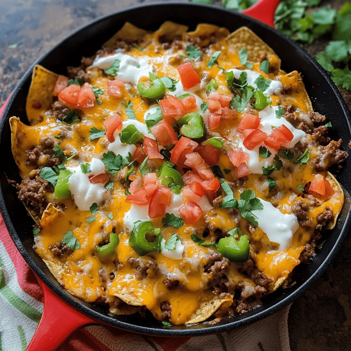 Garnishes: Add fresh toppings like jalapeños and green onions just before serving to maintain their crunchiness, enhancing the flavor of your Cheesy Beef Nacho Skillet.