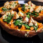 Carefully remove the stuffed sweet potatoes from the oven. Let them cool slightly before serving. Garnish with fresh herbs like parsley or chives, if desired, for a final touch of freshness and color. Serve hot and enjoy your delicious and healthy Chicken & Spinach Stuffed Sweet Potatoes!