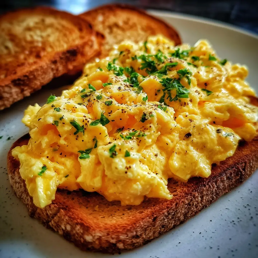 - Season and Serve: Immediately season the eggs in the pan with salt and freshly ground black pepper. Give them one final, gentle fold to incorporate the seasoning. Spoon the creamy scrambled eggs directly onto your prepared toast. Garnish with a sprinkle of finely chopped chives or parsley for a touch of freshness and serve immediately.
