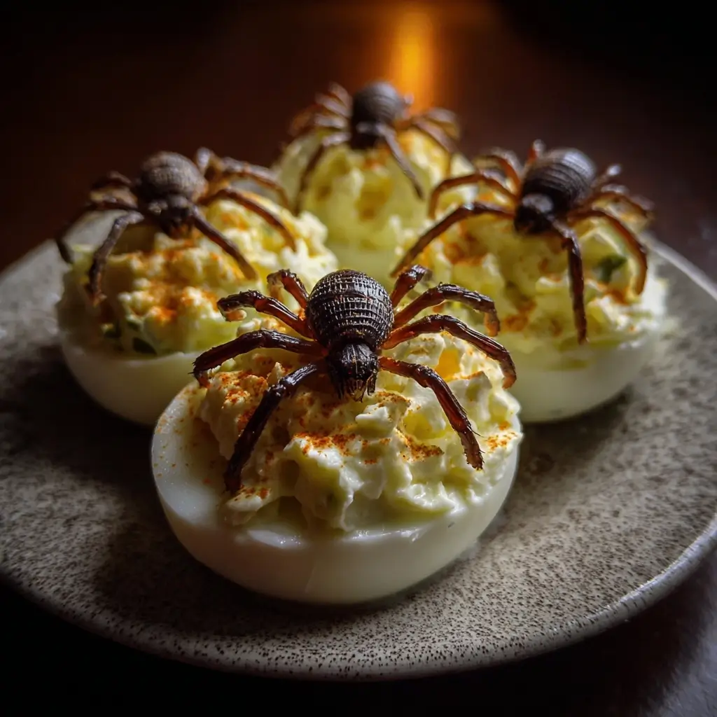 - Final Presentation: Once all your spiders are assembled on the egg salad, your dish is ready to serve! For an extra spooky touch, you can arrange it on a dark-colored platter.