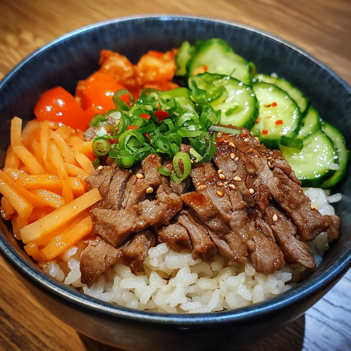 Assemble your bowl by layering fluffy rice and topping with the beef and veggie mix. Garnish with green onions, sesame seeds, or cilantro for extra color and crunch.