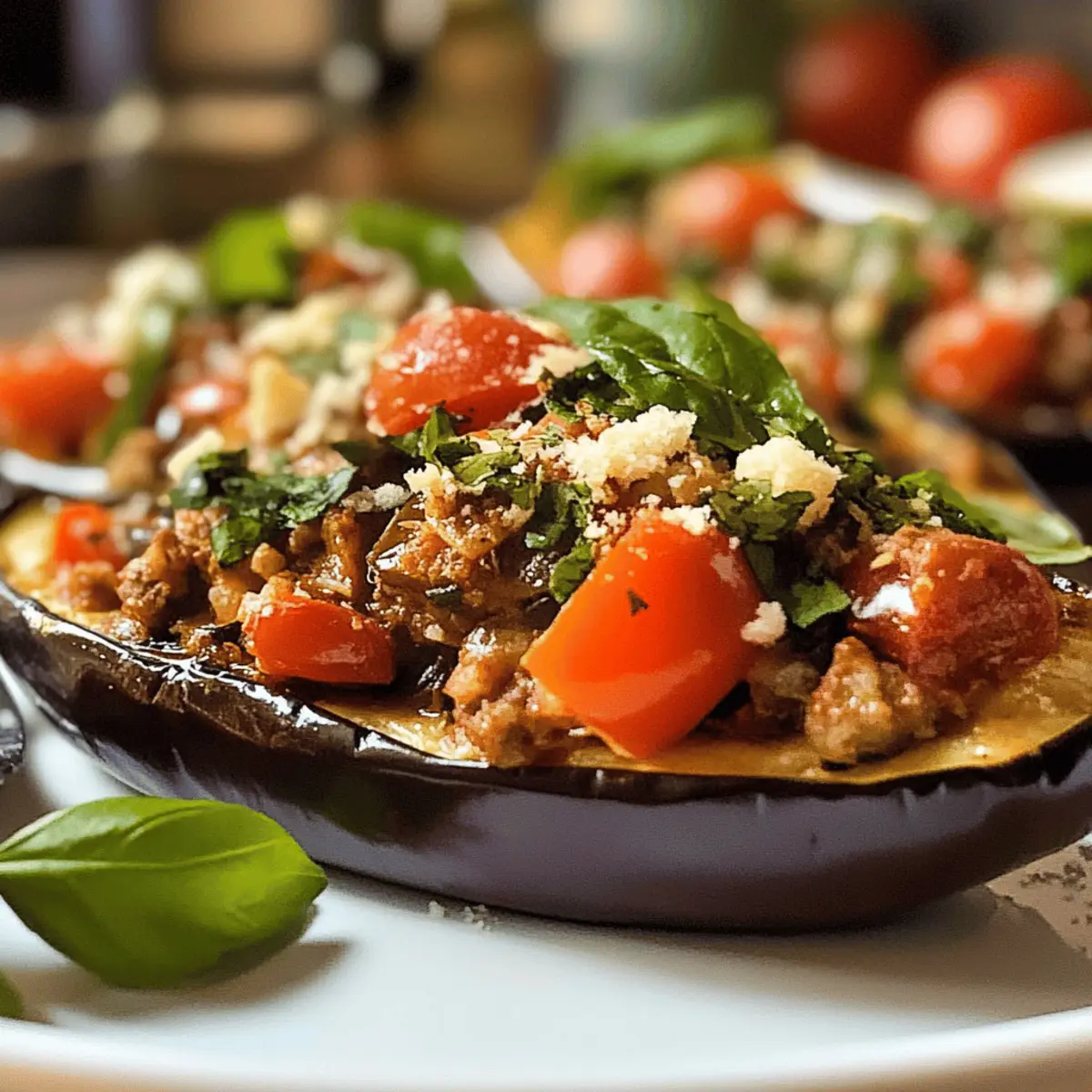 - Fill the Boats: Spoon the savory mixture into each roasted eggplant half, pressing gently so it settles evenly. Make sure each boat is generously filled for perfect flavor in every bite.