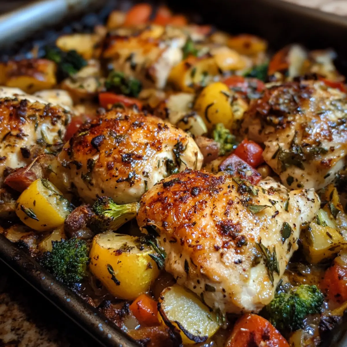 Effortless Cooking: This recipe requires just one pan, cutting down on cleanup and cooking time. Flavor Explosion: Juicy chicken thighs roast alongside a medley of vibrant veggies, soaked in bold, savory seasoning. Healthy & Wholesome: Packed with nutritious ingredients that fuel your body without sacrificing taste. Versatile & Crowd-Pleasing: Perfect for busy weeknights or casual gatherings, it satisfies all taste buds. Comfort Food Magic: Delivers hearty, homemade warmth that beats any fast food fix every time.