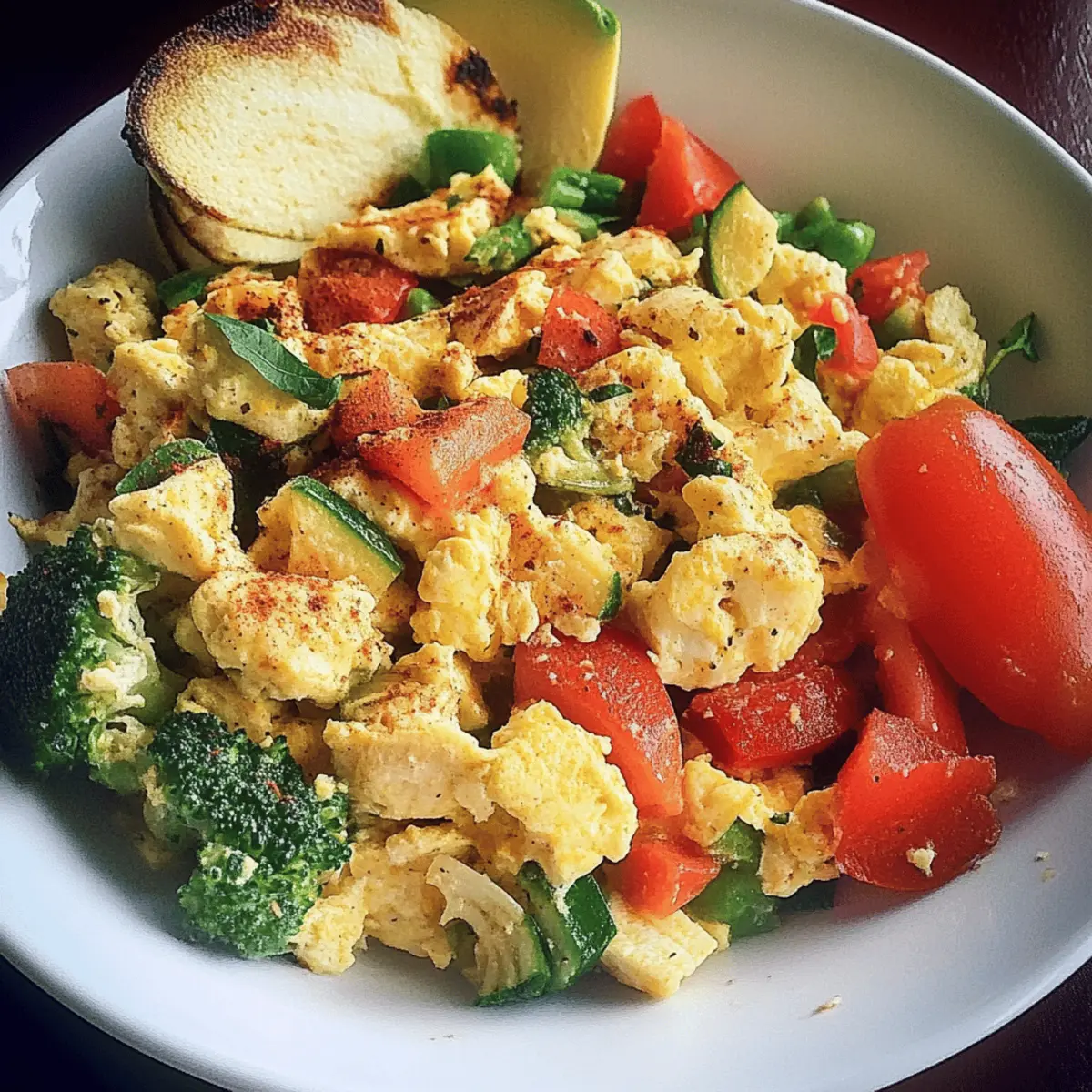 Whole Grain Toast: A slice of crusty whole grain bread adds satisfying texture and complements the scramble’s freshness beautifully.
