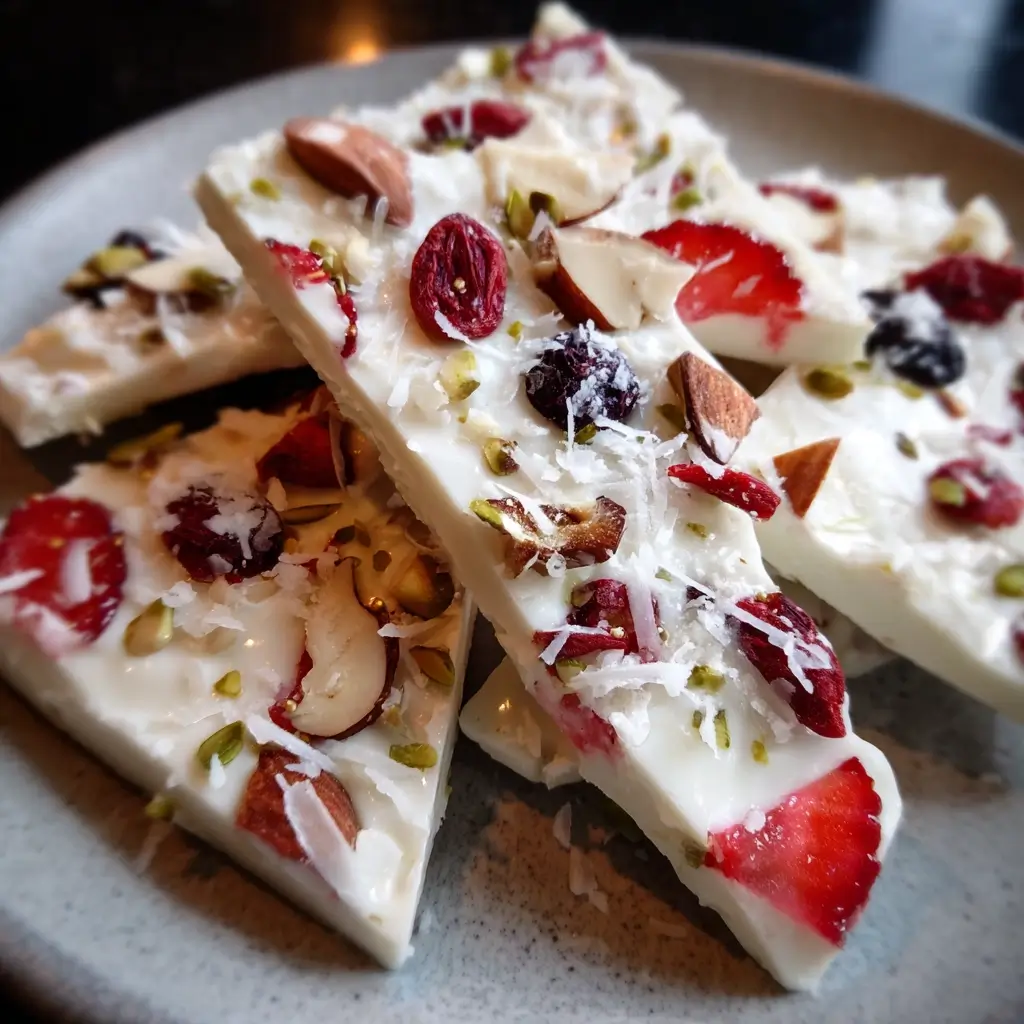 Of all the recipes that have graced my kitchen, few have achieved the legendary status of this Frozen Coconut Yogurt Bark. It all started on a sweltering summer afternoon when the familiar chorus of “I’m hungry!” and “Can we have ice cream?” echoed through the house. I wanted to offer something cool and satisfying, but also something I could feel good about serving. I remembered seeing a similar idea online and decided to put my own spin on it using a tub of creamy, full-fat coconut yogurt I had in the fridge. The process was laughably simple—so simple, in fact, that my kids eagerly jumped in to help, sprinkling their favorite toppings with artistic flair. We waited with anticipation as it firmed up in the freezer, and the first crack of the frozen slab followed by the first bite was pure magic. The bark was a symphony of textures and temperatures: the intense cold giving way to a creamy, tangy yogurt base, punctuated by the sweet burst of fresh berries, the satisfying crunch of toasted coconut, and the rich melt of dark chocolate. It was an instant sensation. It’s now our go-to treat, perfect for an after-school snack, a light dessert, or even a refreshing post-workout refuel. It’s the kind of recipe that makes you feel like a kitchen genius, yet it requires almost no effort at all. This is more than just a recipe; it’s a canvas for your creativity and a guaranteed crowd-pleaser that brings a little bit of healthy joy to any day.