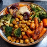 Of all the recipes that have become staples in my household, this Roasted Chickpea & Veggie Plate holds a special place. It was born out of a frantic weeknight, the kind where you open the fridge and see a collection of random vegetables and a can of chickpeas, and you wonder how to turn it into something that feels like a real, satisfying meal. I decided to toss everything onto a sheet pan with some olive oil and my favorite spices, hoping for the best. What came out of the oven forty minutes later was nothing short of a revelation. The aroma of caramelized vegetables and smoky paprika filled the kitchen, and the sight of the vibrant, colorful plate was instantly cheering. My family, initially skeptical of a “just vegetables” dinner, was won over at the first bite. The chickpeas were delightfully crispy on the outside and creamy within, the broccoli had those amazing charred florets, and the bell peppers were sweet and tender. It has since become our go-to meal for a healthy reset, a quick dinner, or a fantastic base for meal prep. It’s proof that sometimes, the simplest ingredients, treated with a little heat and care, can create the most memorable and delicious food.